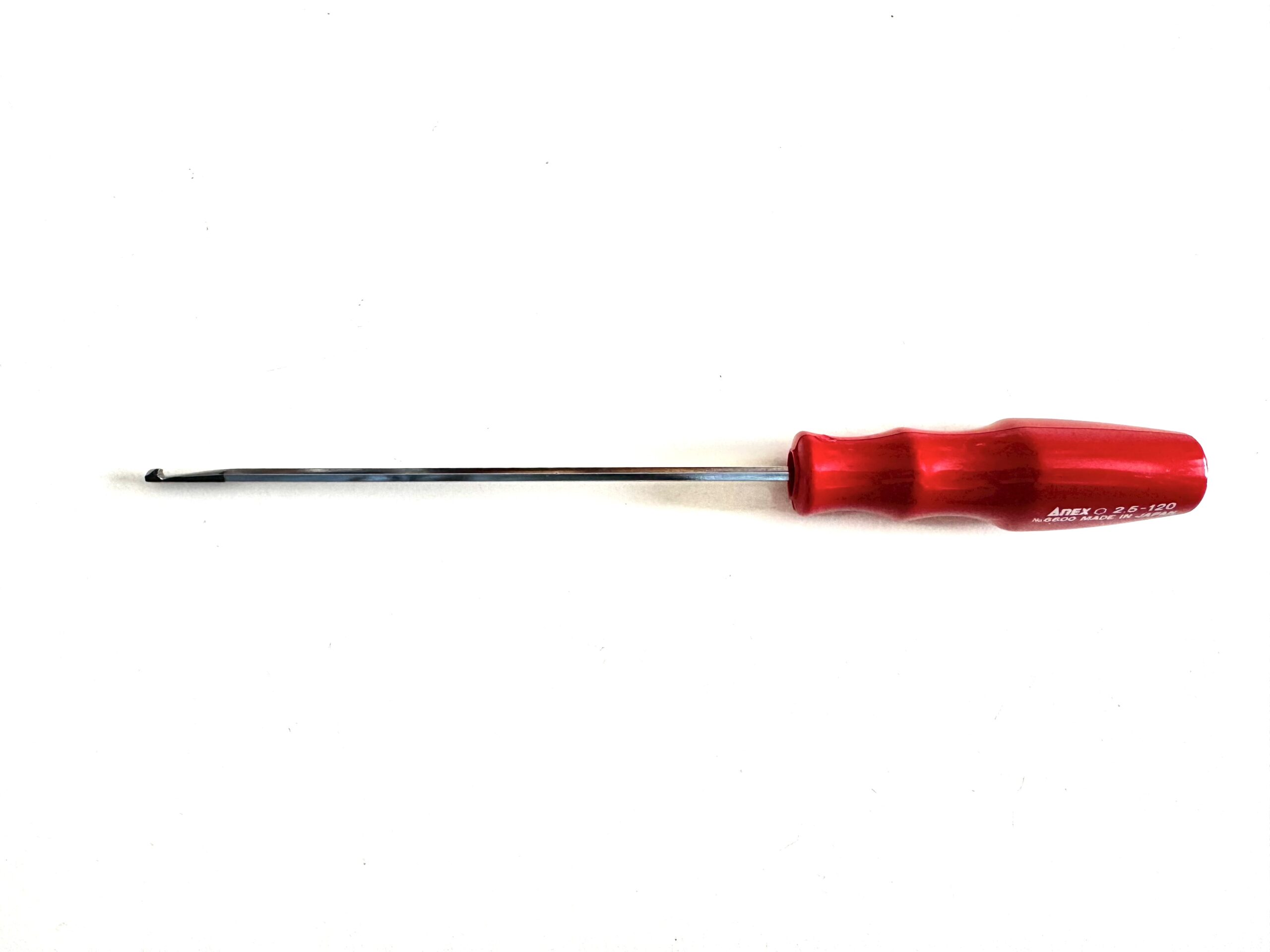 - カポダストロバーかアグラフを上手く通るよう、治具を使って弦を誘導します(元は六角レンチのドライバー)