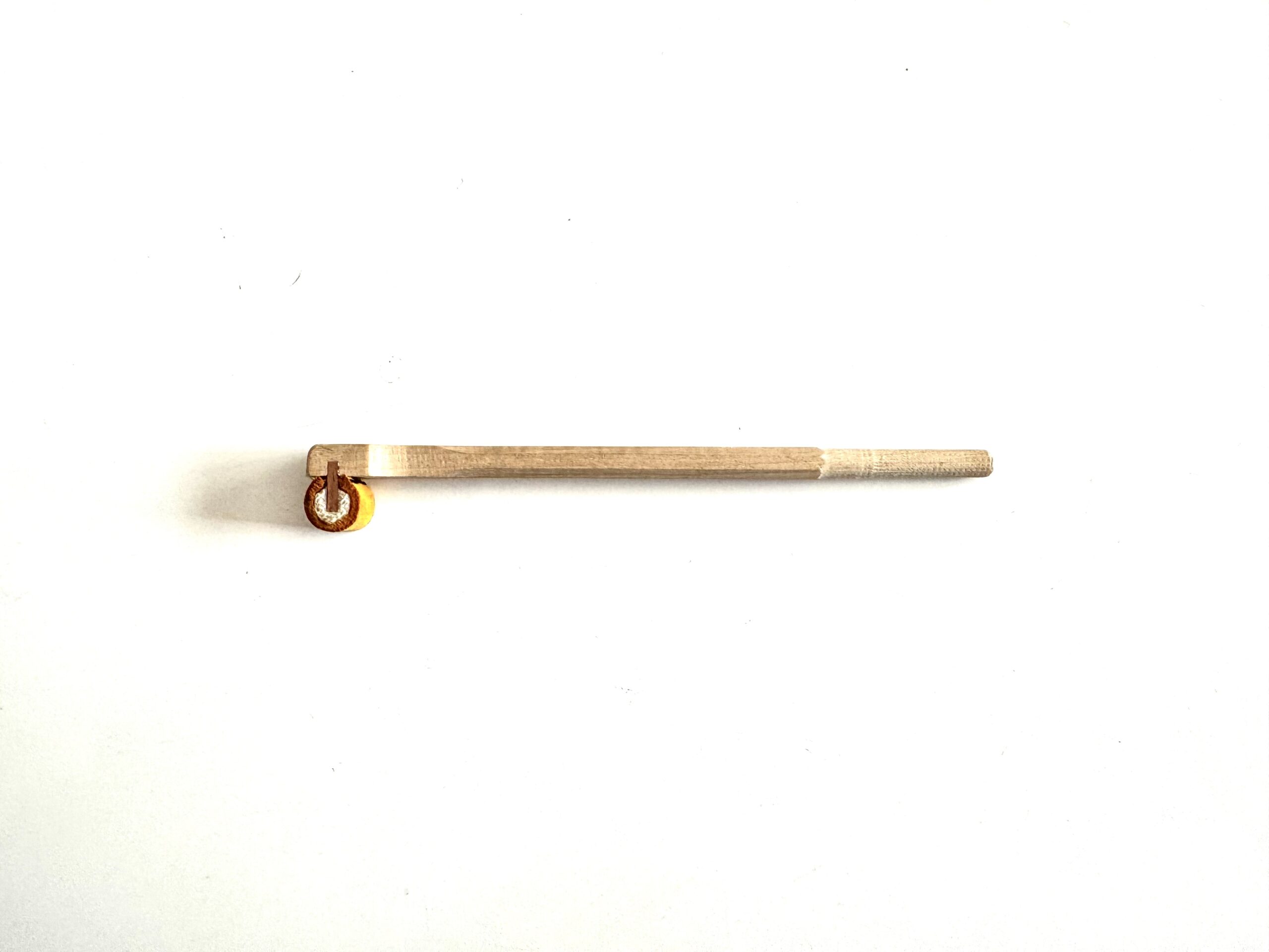 - チューニングピンに見立てた治具を使い、弦の先端に巻癖を付けます(元はチューニングピンと鉄芯)